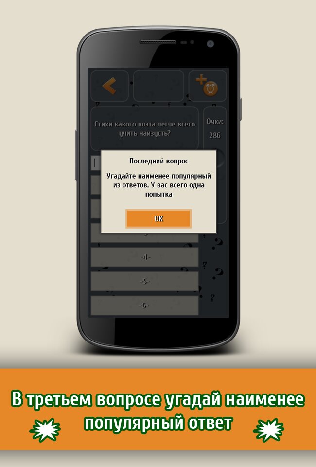 Викторина «Большой вопрос» заставит тебя пошевелить мозгами! Вопросы из игры задавались сотне простых людей. Тебе нужно угадать их самые популярные ответы. 30 секунд и 3 жизни — это все, что спасет тебя от краха!