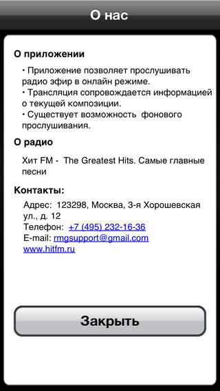 Хит FM The Greatest Hits. Самые главные песни. Для прослушивания потокового аудио потребуется интернет соединение (EDGE, 3G или Wi-Fi). Приложение – полностью на русском языке. Поддерживает iOS3/4 и работу в фоновом режиме. Трансляция сопровождается информацией о текущей композиции.