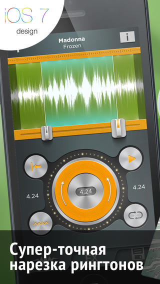 Это приложение поможет максимально точно нарезать любой рингтон, обработать его, сохранить себе и поделиться им с друзьями. Особенности: – удобное управление нарезкой – точность до 0,01 сек. при нарезке – 6 звуковых эффектов – запись с микрофона – все типы тонов – шаринг рингтонов – синхронизация через Dropbox – внутренняя библиотека рингтонов – возможность слушать готовые рингтоны прямо из приложения – простой и понятный интерфейс – графика высокого разрешения – удобные подсказки – встроенное видео в помощь новичкам – поддержка 9 языков.