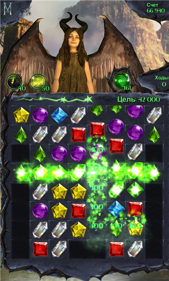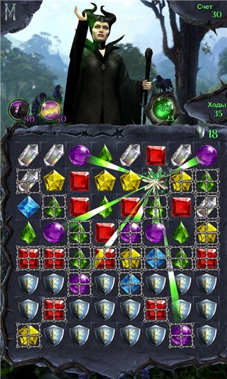 Увлекательная игра-головоломка из серии «три в ряд» создана по мотивам нового фильма студии Disney «Малефисента». Она подарит Вам потрясающее приключение, полное непростых заданий. Перед Вами появится поле с камнями различных цветов. Вам необходимо передвигать кристаллы таким образом, чтобы собрать комбинации одного цвета, которые должны состоять от трех и более камней. Ну, а если у Вас что-то не будет получаться, к Вам на помощь придет ворон Диавалем со своими подсказками, а также дополнительные бонусы, которые можно получить, если разрушить определенные комбинации кристаллов.