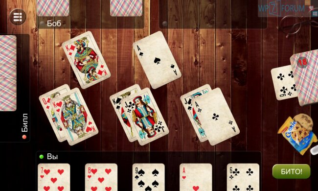 Какая самая популярная карточная игра в России? Большинство ответят, что «Дурак», и они будут правы. В него играли все. «Durak» для Windows Phone — это самая качественное исполнение популярной игры. Помимо обычного «Подкидного Дурака», здесь есть другие типы игры, такие как «Дурак Переводной», «Безмастный» или даже «Чукотский». В начале кона вам нужно будет выбрать количество игроков (от 2 до 4). Ну а дальше, я думаю, знаете. Раздается по 6 карт и начинается игра. Стоит отметить очень качественную графику и анимацию. Радует стол, на котором вы играете — помимо карт на нем расположились чьи-то старые очки и распечатанная упаковка с крекером. Играть в такую игру — одно удовольствие. И всё это бесплатно и на русском языке!