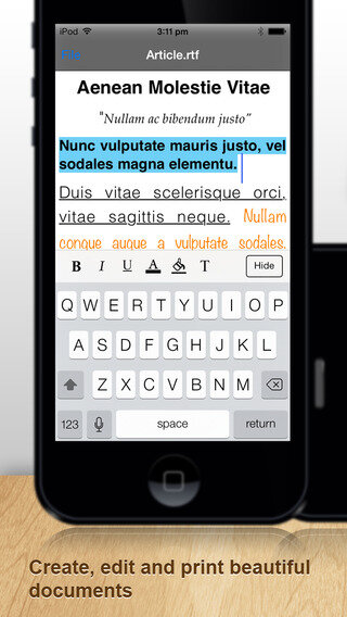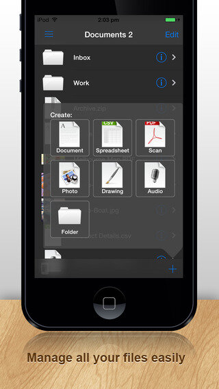 Наиболее полный мобильный офисный пакет и система управления файлами для iOS. Программа позволяет вам хранить, управлять, печатать и делиться всеми вашими фотографиями, документами, таблицами и записями из одного места на вашем iPhone, iPod, and iPad. Пользовательский интерфейс, созданный по образу и подобию проводника/диспетчера. Вы можете просматривать, редактировать, отправлять по почте, wifi/usb, отправлять на печать через AirPrint и загружать ваши файлы в аккаунт Google.
