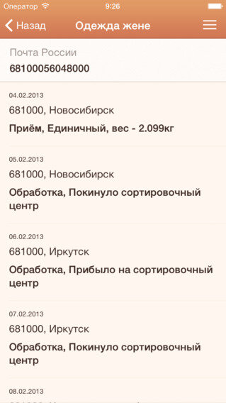 С помощью этого приложения вы сможете удобно и быстро отслеживать свои почтовые и экспресс отправления. Достаточно внести номер отправления и его название — и Вы всегда сможете отследить его, где бы Вы не находились. Уникальная система распознавания почтовой службы на основе введенного номера делает добавление нового отправления особенно быстрым. Вы так же можете отследить текущее местоположение отправления на карте — это особенно актуально для международных отправлений. На данный момент для отслеживания в программе поддерживаются 140 почтовых служб, включая российские Почта России, ЕМС Почта России, Pony Express, Major Express, Экпресс-Курьер ( edostavka.ru), Гарантпост, Деловые линии, а так же зарубежные China Post, DHL, USPS, UPS, FedEx, Royal Mail, Deutsche Post, Укрпошта, Казпост, Белпочта и многие другие.