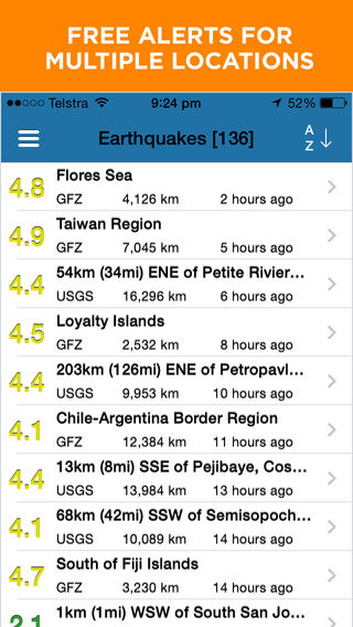 — Приложение для мониторинга землетрясений на основе данных, собранных рядом учреждений во всем мире. Оно отображает землетрясения с магнитудой выше 4.0 зарегистрированных в течение последних 7 дней для Европы, Северной Америки, Австралии, Новой Зеландии, Азиатско-Тихоокеанского региона и остального мира.
