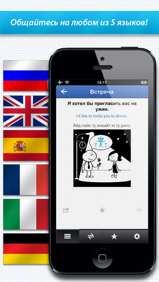 Мобильный иллюстрированный разговорник английского, испанского, немецкого, итальянского и французского языков. Так же, эта программа содержит упражнения для заучивания слов и целых фраз, обладает озвучкой слов носителями языка, позволяет просмотреть прикольные картинки для запоминания каждой фразы, а так же позволяет быстро найти нужные вам слова в разговорнике, благодаря удобной группировке фраз по темам: «Здоровье», «Транспорт», «Гостиница», «Магазины», «Досуг», «Спорт», «В городе» и проч.