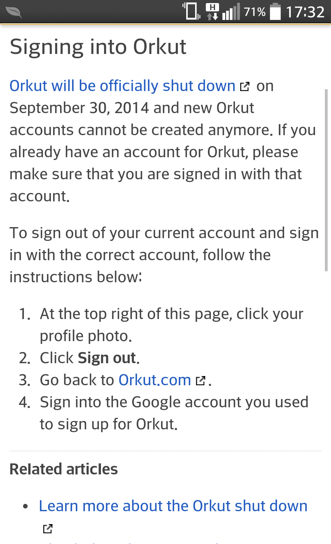 По состоянию на сегодня проект Orkut уже не существует, официально, и если вы перейдете по URL-адресу, то вас встретит страница поддержки, сообщающая о том, что социальная сеть завершает свою работу и, как ни странно, найдете инструкцию по входу обратно в систему, которая перенаправит вас на ту же страницу. Предполагается, что данная страница в ближайшее время будет изменена и обновлена более актуальной информацией.