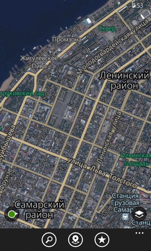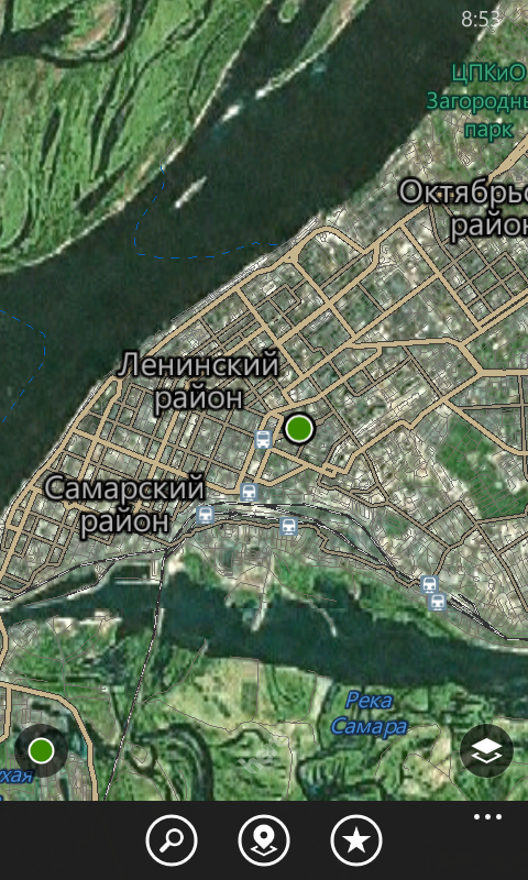 Пользовательский интерфейс приложения интуитивен и понятен. Отображение карт работает в трех режимах: «Спутник» (правда, в данном случае качество реально оставляет желать лучшего), «Транспорт» (со схемами улиц, жилых домов и зданий) и «Дорожное движение» (показывает пробки). В верхней части располагается панель поиска. При открытии ее и впоследствии буквально нескольких нажатий вы можете проложить путь из текущего местоположения до найденного на карте места (количество организаций зависит от зума). На этом экране пользователю будет показываться время езды на автомобиле, общественном транспорте или ходьбы пешком, а также расстояние в километрах и приблизительное время прибытия в пункт назначения.