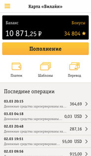 Приложение для владельцев платежных карт Билайн. Благодаря этому приложению, вы сможете пополнять карту Билайн с банковских карт Visa и Master Card, оплачивать товары и услуги, погашать кредиты, отправлять денежные переводы и многое другое.