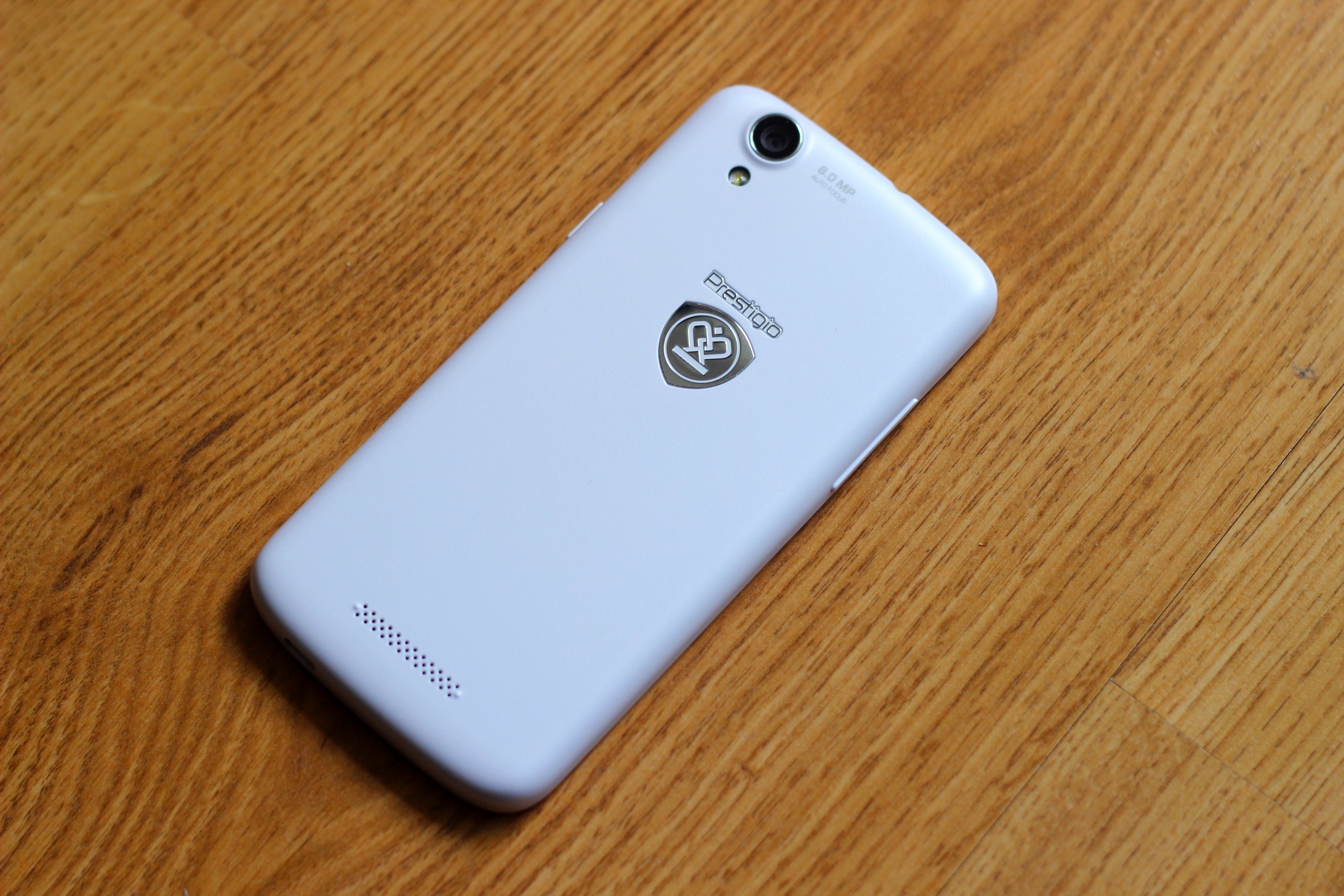 Prestigio 5453 DUO имеет вполне стандартный дизайн. Стоит отметить, что изюминка в нем есть, на задней панели присутствует эмблема бренда, и выглядит очень стильно и элегантно. Смартфон поставляется в трех цветовых вариациях: белой, черной и бронзово-серой.