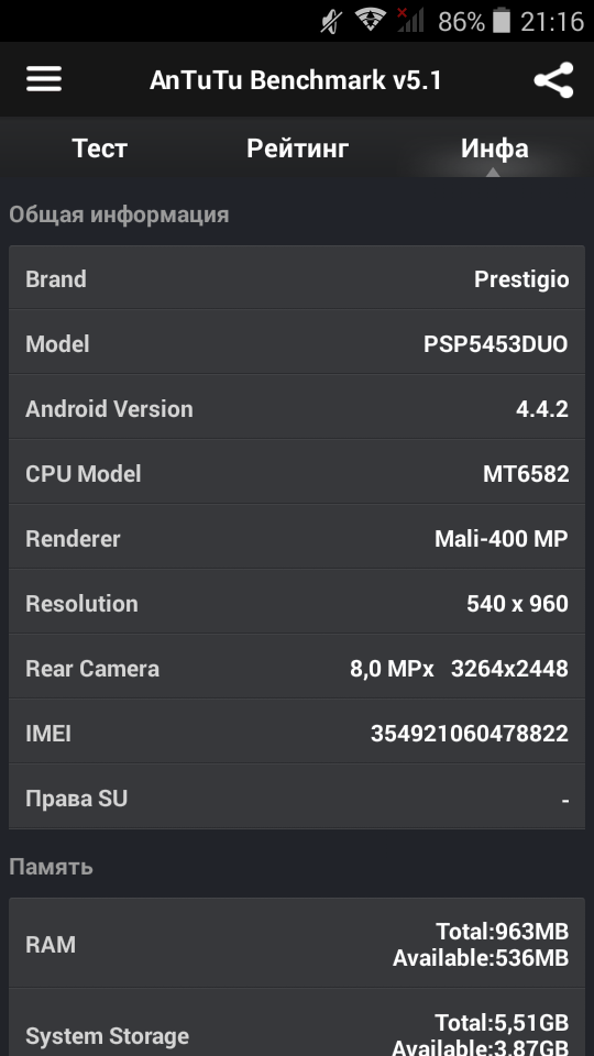 Prestigio 5453 DUO работает под управлением системы Android 4.4.2. Фактически, система на смартфоне стоковая — то есть здесь используется стандартный интерфейс Android и все приложения имеют дизайн от Google. Есть возможность использовать стандартную клавиатуру или фирменную от Prestigio.