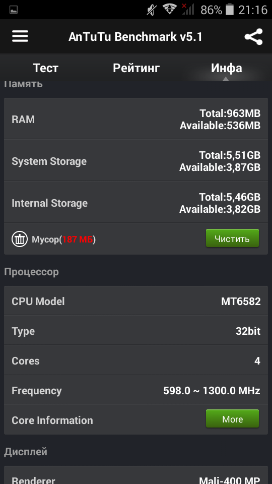 - Процессор: четырехъядерный MediaTek MT6582, 1.3 ГГц