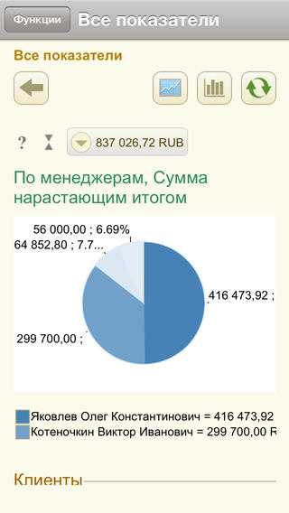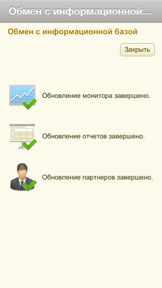 — Это приложение реализует базовые возможности мониторинга целевых показателей, просмотра отчетов, просмотра информации о партнерах совместно с коробочным решением «1С: Управление торговлей 8» Приложение позволяет: — быстро просматривать состояние целевых показателей в виде диаграмм и детальных отчетов; — расшифровывать целевые показатели с помощью отчетов-расшифровок; — просматривать отчеты, доступные пользователю в панелях отчетов коробочных решений; — просматривать контактную информацию партнеров, их досье, а также совершать им звонки; — синхронизировать данные выборочно для сокращения времени синхронизации.