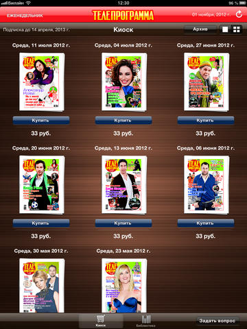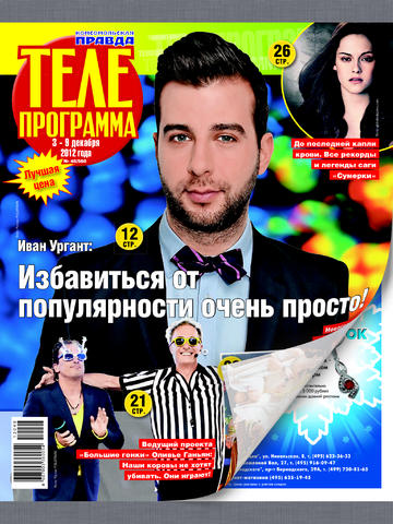Приложение позволит вам читать на iPad электронную pdf-версию московского выпуска еженедельного гида по программе телепередач “Телепрограмма”. В киоске вы можете купить как свежий номер издания, так и оформить подписку на длительный период. В этом случае стоимость каждого отдельного номера будет во много раз ниже. Подписка на электронную версию газеты обойдется намного дешевле, чем на ее бумажный аналог с доставкой на дом. Издание выходит один раз в неделю по средам. После скачивания приложение “Телепрограмма” окажется в “Киоске” (Newsstand в англоязычных интерфейсах планшетов) — электронном хранилище периодических изданий. Иконка “Киоска” (Newsstand) находится на первом экране планшета. Если вы не подписаны на издание, архив и новые номера газеты доступны для покупки в разделе “Киоск” приложения. После покупки скачать номер можно в разделе “Библиотека”. Там же хранятся купленные Вами ранее номера, и туда же попадают свежие выпуски, в случае подписки на газету. Для каждого пользователя доступен бесплатный ознакомительный номер. Он тоже хранится в “Библиотеке”. При оформлении подписке автоматически поступает свежий номер издания. «Телепрограмма» — один из крупнейших телегидов России. Тираж номера — 1,2 миллиона экземпляров. Удобная программа федеральных и кабельных каналов с анонсами фильмов и передач. Эксклюзивные интервью с российскими и зарубежными звездами телевидения и кино. Репортажи со съемок популярных программ. Все о сериалах. Кулинарная, автомобильная рубрики; рецепты оздоровления; детская страничка. Гороскоп, лунный календарь и большой сканворд в каждом номере!