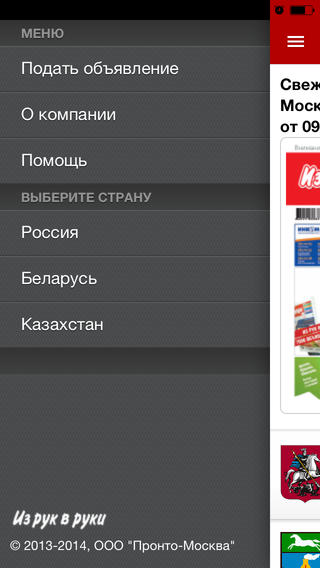 — Эта программа позволит вам просматривать печатные издания медиахолдинга «Пронто-Москва» на своем iPhone или iPad. С ее помощью вы получите доступ к полной базе объявлений по России, а также Белоруссии и Казахстану. Программа Издания Из рук в руки обладает удобной навигацией по разделам и рубрикам, позволяет просматривать эксклюзивные тематические материалы и новости, просматривать свежие выпуски изданий в формате PDF, а так же поможет связаться с рекламодателем или продавцов, скопировав их контактные данные.