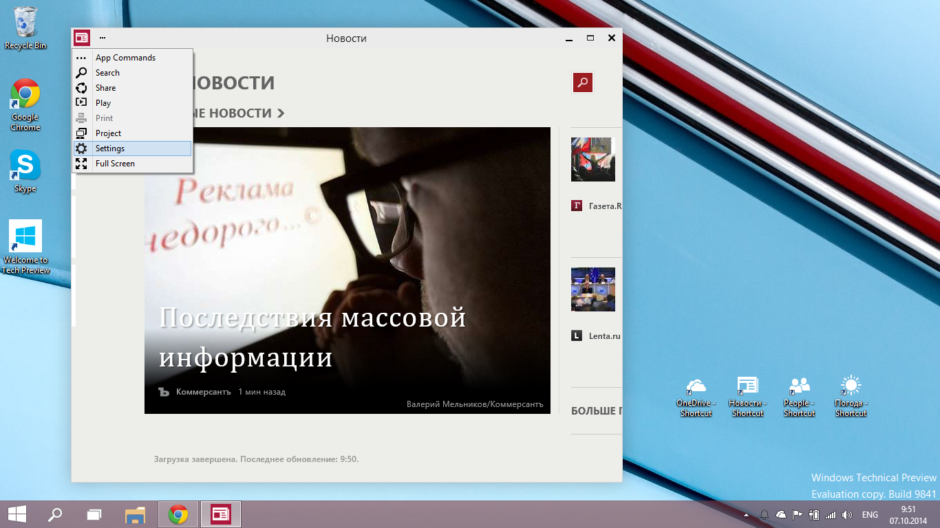 Так как боковая панель, именуемая «Charms Bar», удалена в Windows Technical Preview и в дальнейшем Windows 10 специально для компьютеров (ей просто не пользовались), а также можно сворачивать приложения Metro в окна, все доступные настройки перенесли в специальное меню, располагающееся в отдельной кнопке с символом троеточия. По клику вам откроются не только настройки открытого приложения, но и другие функции — поиск, расшаривание, печать, открытие в полноэкранном режиме и другое. От себя добавлю: как по мне, это неудобно — сначала нужно кликнуть на три точки, затем откроется боковая панель и нужно будет там кликнуть на «Настройки» и уже потом они станут вам доступны. Напоследок отмечу, что все окна стали отбрасывать тень (если вы заметили, то напишите в комментариях, нравится ли).
