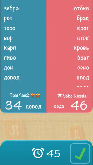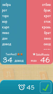 Игра напоминает всеми известную «Балду». В вашем распоряжении 16 ходов, а на игровом поле из 25 клеток заполняются 2 слова (в средних рядах по вертикали и горизонтали). Задача каждого игрока состоит в том, чтобы поочерёдно добавлять одну букву и уже с помощью неё составить новое слово. На каждый ход даётся 45 секунд. Начисление очков происходит за каждую букву слова отдельно. За пропуск хода отнимается 3 очка. Победителем является игрок, набравший большее количество очков на момент заполнения последней клетки поля.