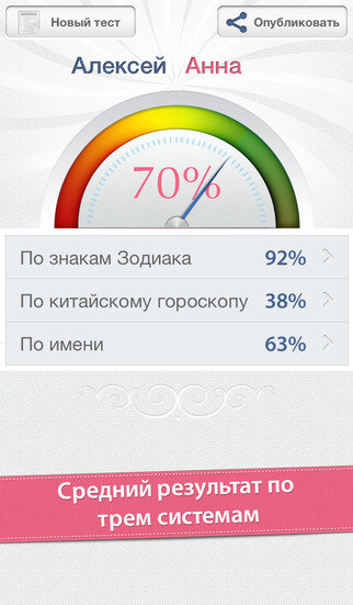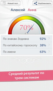 — Приложение, которое поможет в считанные секунды узнать вашу совместимость с партнером. В нем используется сразу три системы расчета: — совместимость по знаку зодиака — совместимость по китайскому гороскопу — совместимость по именам.
