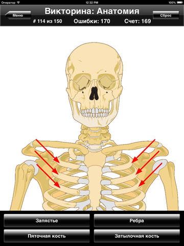 «Викторина: Анатомия» предлагает Вам проверить свои знания анатомии человека. Приложение может быть использовано для тестирования и обучения людей, как хорошо знающих анатомию, так и просто ранее изучавших ее в школе. Игра состоит из 150 иллюстрированных вопросов по следующим направлениям: — Органы пищеварения и дыхания; — Части глаза; — Части мозга; — Части сердца; — Мышцы; — Скелет; — Голова и шея; — Кости кисти; — Кости стопы; — Позвоночник и ребра; — Нёбо; — Зубы; — Брюшная полость и таз. Каждый вопрос имеет 4 возможных варианта ответа. При выборе одного из вариантов, цвет нажатой кнопки ответа изменится на зеленый (если это был правильный ответ) или на красный (неправильный ответ). Если Вы ответите правильно с первой попытки, то получите 3 балла, со второй – 2 балла, с третьей (последней) — 1 балл. Сыграйте в «Викторину» и узнайте, насколько хорошо Вы знаете анатомию человека!