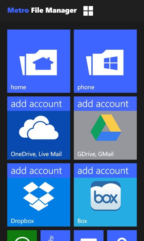 Файловый менеджер в metro-стиле для WP. Поддерживает синхронизацию с Dropbox'ом и Google Drive, имеет встроенный архиватор и просмотрщик некоторых типов файлов. Отличается тем, что может открывать файлы через меню «отправить» — таким образом можно их вытаскивать даже из самых непослушных приложений.