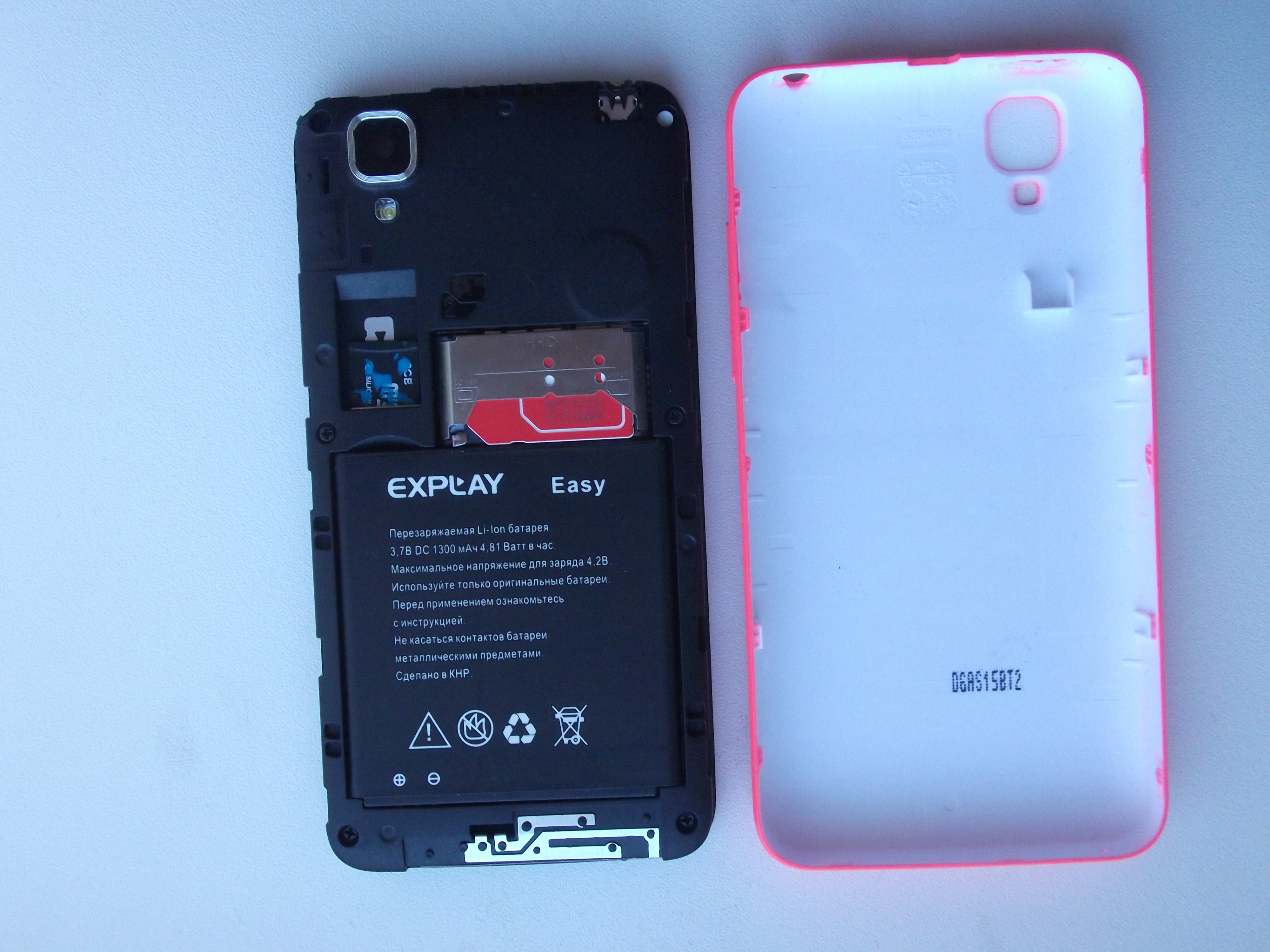 Под крышкой устройства расположены слоты для сим-карт (для 2-х сим-карт обыкновенного размера), слот для MicroSD карты и аккумулятор ёмкостью 1300 мАч, которого хватает примерно на день активного использования при средней яркости.