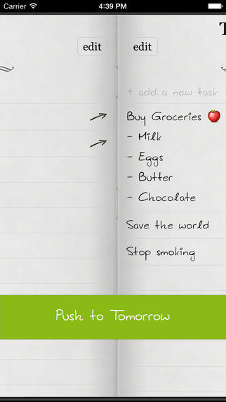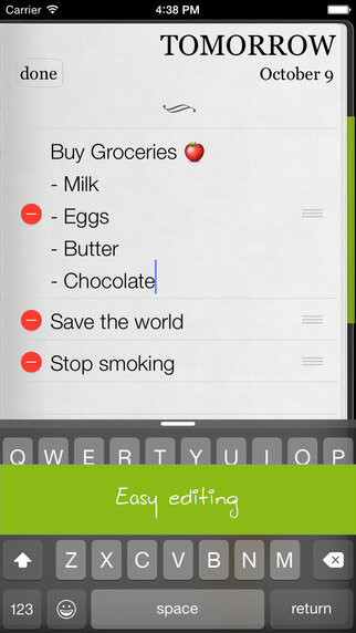 Любите откладывать дела на завтра? Почему бы не запланировать свои завтрашние дела? В этом вам поможет простой и удобный TODO органайзер. — Быстрый интуитивно понятный ввод задач. — Простой интерфейс — Удобный доступ ко всем важным функциям (удаление, пометки на завершение и тп)