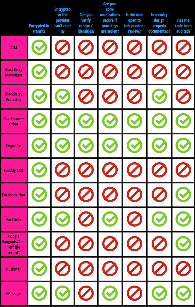 Рейтинг под названием Secure Messaging Scorecard составляется по нескольким критериям защищенности мессенджеров, а именно: шифрование, уровень конфиденциальности и открытость кода пользователю. Согласно новому рейтингу от Electronic Frontier Foundation сервисы для обмена сообщениями iMessage и FaceTime от компании Apple и для ее устройств являются самыми защищенными среди распространенных пользовательских решений. Фирменные мессенджеры для iOS и OS X от компании Apple получили больший рейтинг, чем Skype от Microsoft и BlackBerry Messenger.