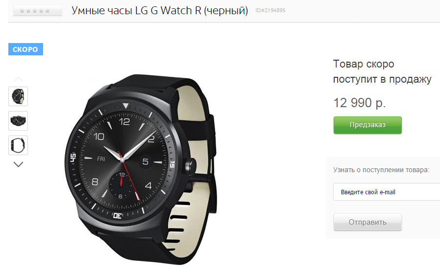 Часы LG G Watch уже доступны для предзаказа у некоторых российских ритейлеров. Полноценные продажи должны начаться в середине ноября. Стоит отметить, что новинка от LG — это первые действительно полноценные умные часы с круглым дисплеем и циферблатом вокруг него. В часах Moto 360 присутствует особенность экрана, которая делает часы не совсем круглыми, по крайней мере одна грань нарушает всю идиллию.