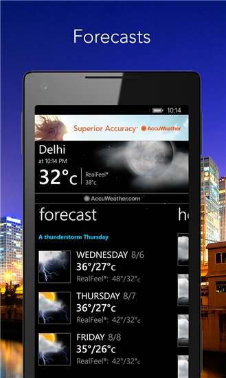 Наши градусники все еще не способны предсказать погоду, которая будет за окном через два часа, ближе к середине или к концу дня, а то и вовсе на несколько дней вперед. Однако, такой возможностью наделены приложения, которые можно установить на наши Windows Phone-устройства. Одним из таких является «AccuWeather». Благодаря нему, Вы всегда будете получать точную информацию о температуре и погодных условиях за окном, о силе ветра, влажности, видимости, давлении и облачности. Кроме того, Вы сможете увидеть прогноз на весь день и неделю, узнать, будут ли погодные условия благоприятны для определенного вида деятельности и даже посмотреть время наступления рассвета и заката. Ну и в завершении стоит добавить, что данное приложение обладает красивой прозрачной и, в то же время, живой плиткой, которая будет отлично сочетаться с рабочим столом Вашего смартфона.