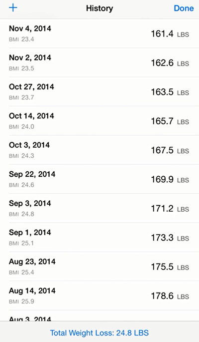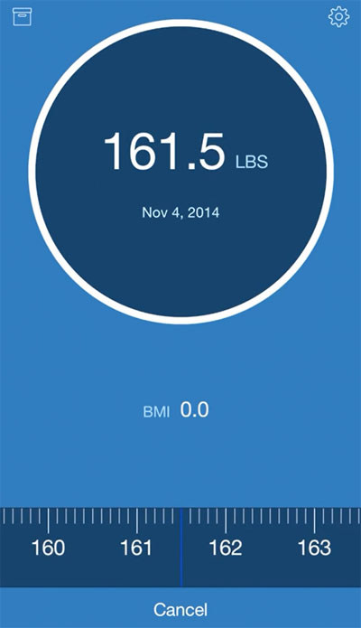 Для начала выставляете свой текущий вес. Лучше всего, если ваши весы поддерживают значения в фунтах, LBS. Но если нет – ничего страшного, просто делим цифру в килограммах на 0,45. Отмечаем получившееся значение. Вводим свой пол и рост (это будет нужно для расчета BMI). Ура, самый сложный этап пройден! Теперь остается каждый раз после измерения веса заходить в утилиту, тапать на большой кружок и перемещать линейку внизу влево или вправо настолько, насколько вы похудели или пополнели. Получается наглядная презентация того, как успешно вы справляетесь с похудением или набором веса.