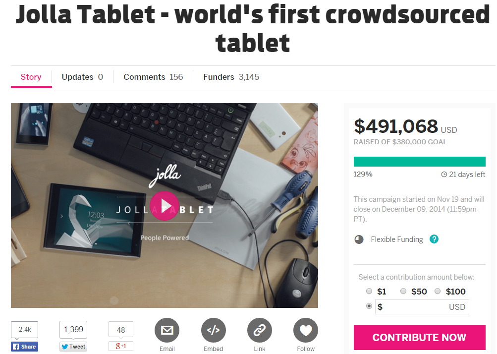 Всего пару часов назад компания Jolla представила свой планшет и начала краудфандинговую кампанию по финансированию его выпуска. Напомним, в качестве площадки для сбора средств компания Jolla выбрала не популярный Kickstarter, а IndieGoGo, на которой не так давно компания Canonical пыталась собрать астрономическую сумму на свой смартфон с Ubuntu Touch. И вот спустя пару часов проект Jolla уже собрал необходимую сумму для осуществления производства планшета.