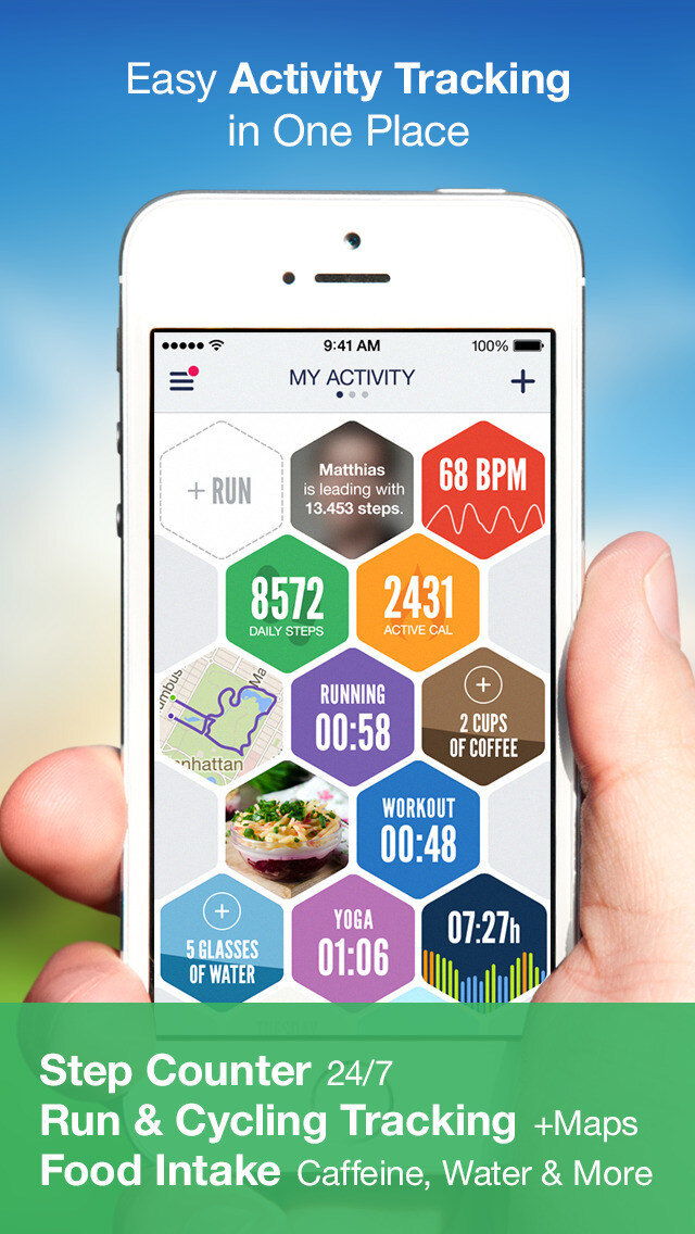 Еще один плюс, из-за которого стоит остановить свой выбор на этом приложении, — его оригинальный интерфейс, напоминающий пчелиные соты. Очень удобно и оригинально. Работа с Argus напоминает использование остальных сервисов аналогичного назначения. Вы указываете свой возраст, рост и вес, задаете точки мотивации (запланированное количество шагов, сожженные калории и пр.), после чего можно приступать к фиксации активности.