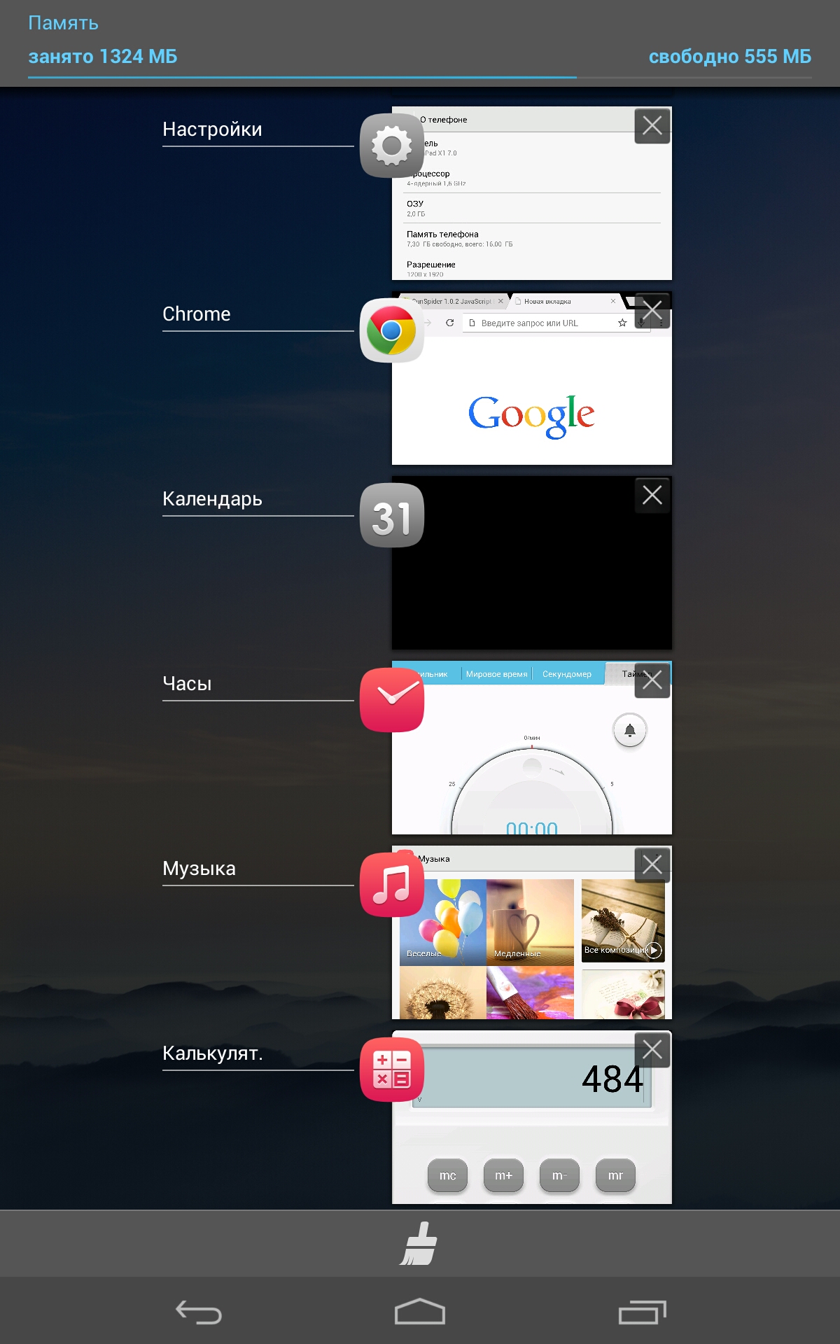 Диспетчер задач отображает список недавно открытых приложений в виде миниатюр, здесь же отображается количество занятой и доступной памяти, присутствует функция очистки памяти и крестики для закрытия отдельных фоновых приложений.