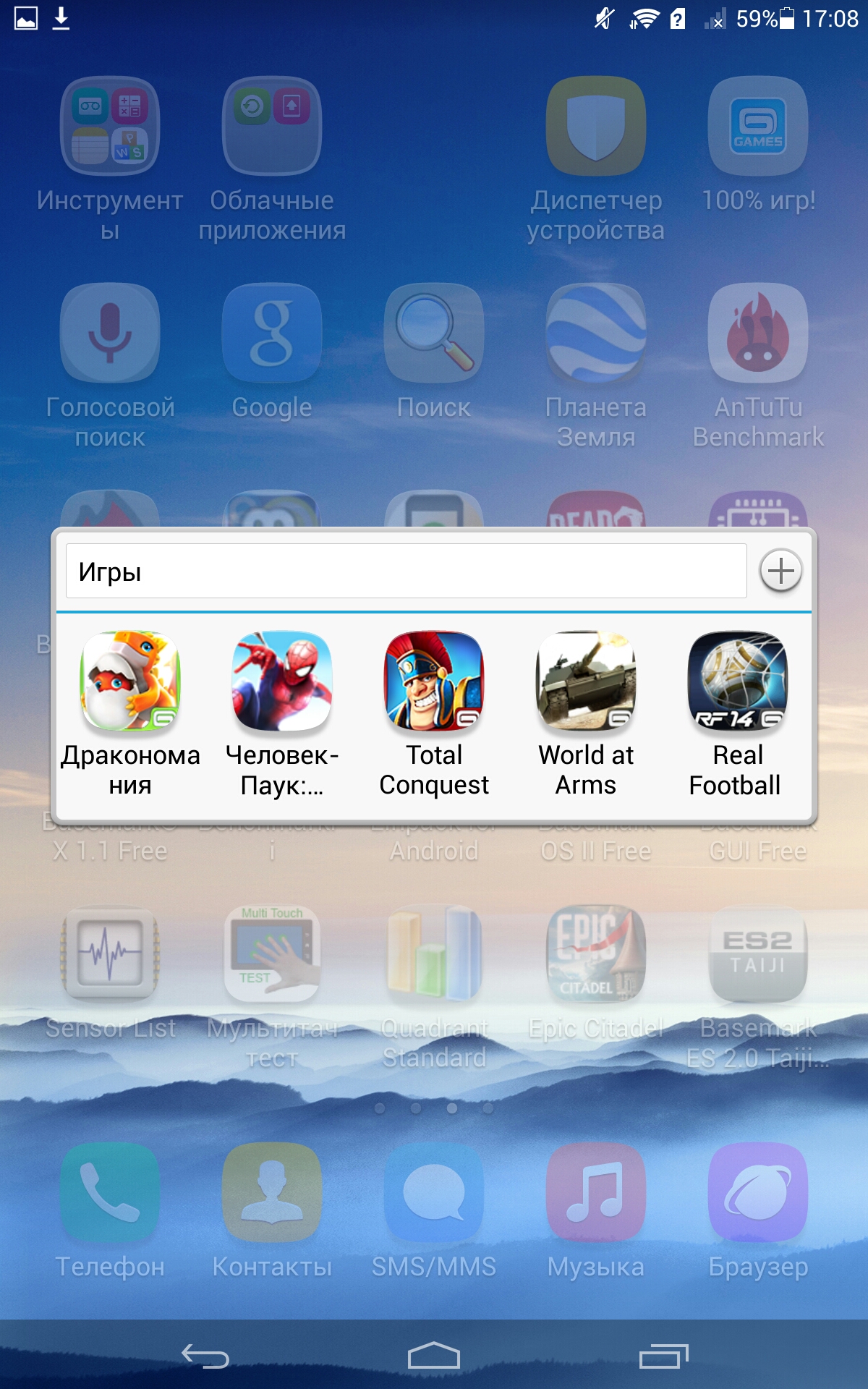 На планшете “из коробки” предустановлены несколько игр от Gameloft, такие как Человек-Паук, Real Football, World at Arms, впрочем они без всякого труда удаляются.