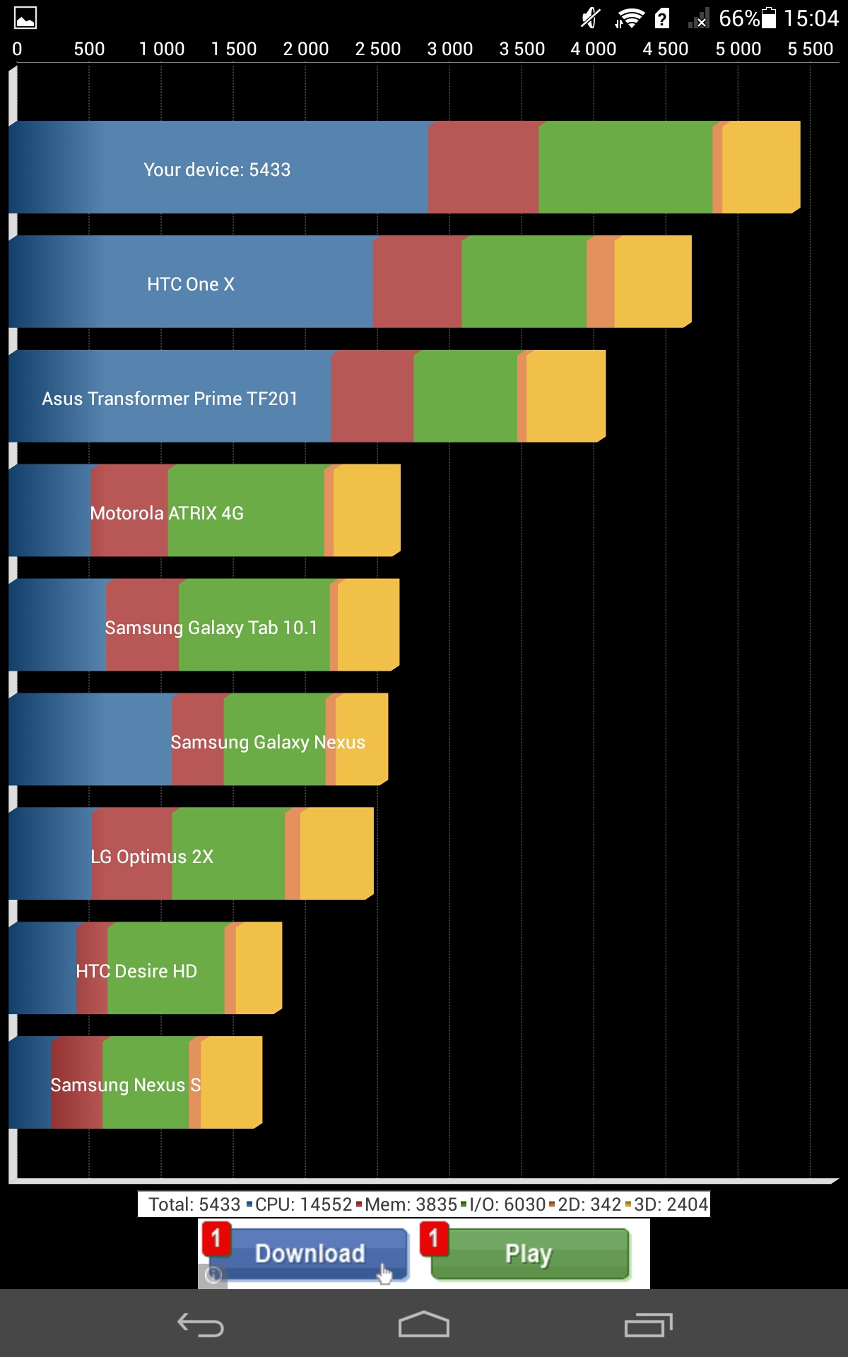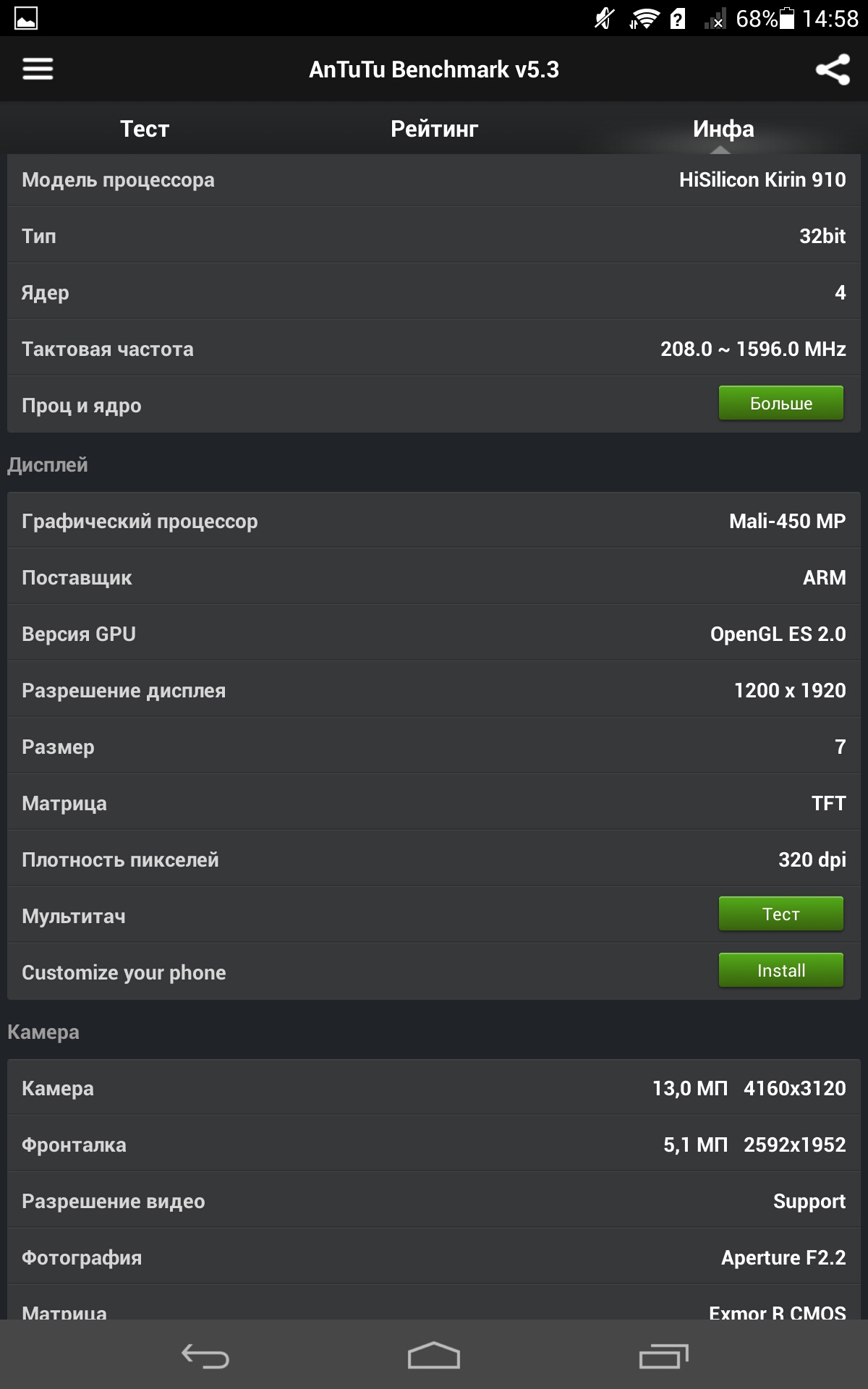 Результаты тестирования в синтетических бенчмарках подтвердили недостаточную, как для флагмана, производительность планшета. Конечно же, планшет оборудован FullHD экраном, который требует дополнительной мощности для просчета графики, но тот же Sony Xperia Tablet Z2 с аналогичным разрешением, показал чуть ли не в 2 раза лучший результат. Как оказалось, процессоры Hisilicon выигрываются в плане энергосбережения, но остаются далеко позади процессоров Qualcomm в плане производительности.
