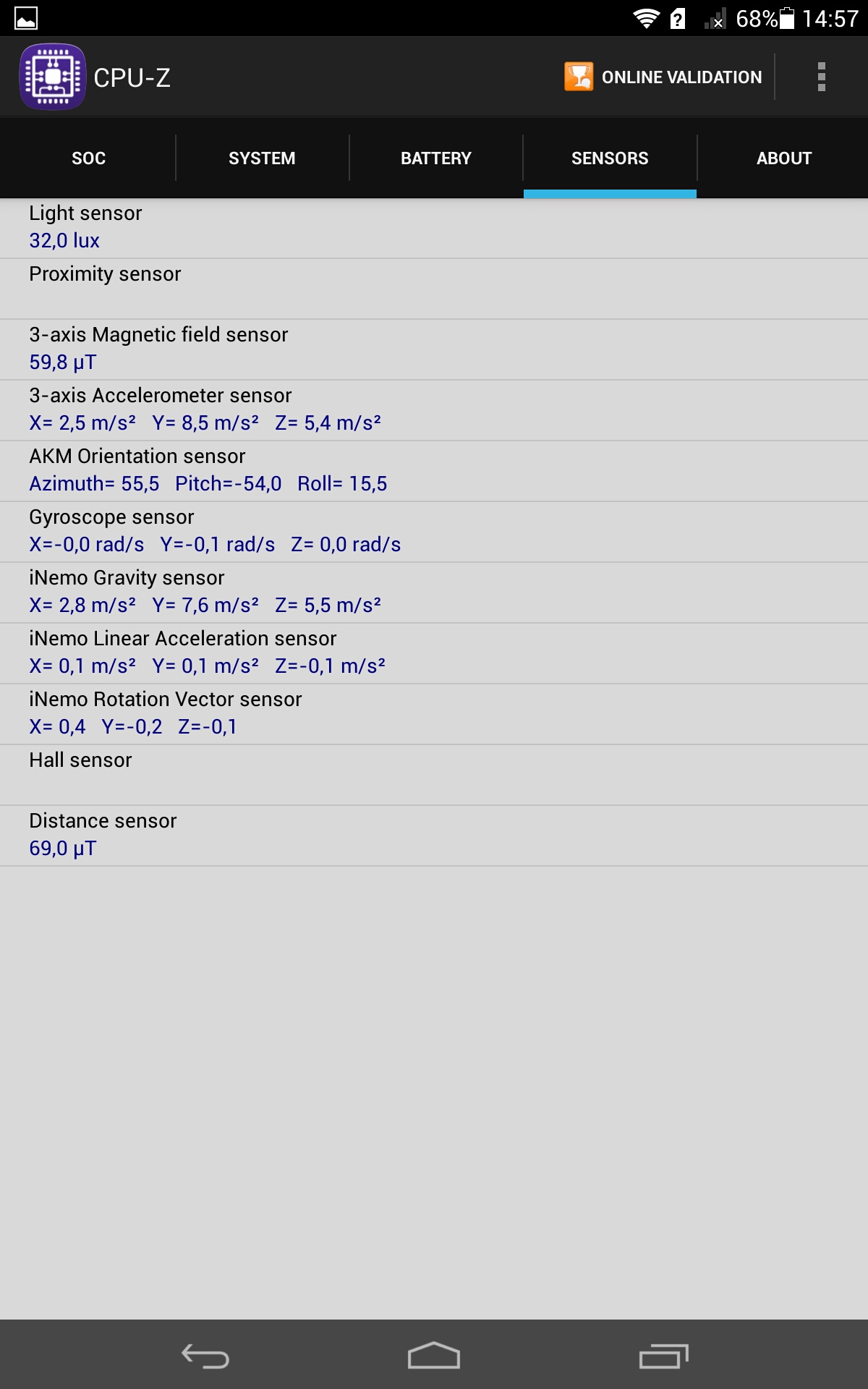 Из датчиков здесь присутствует: акселерометры (их тут несколько), гравитационный сенсор, датчик линейного ускорения, компас, датчик света и приближения.