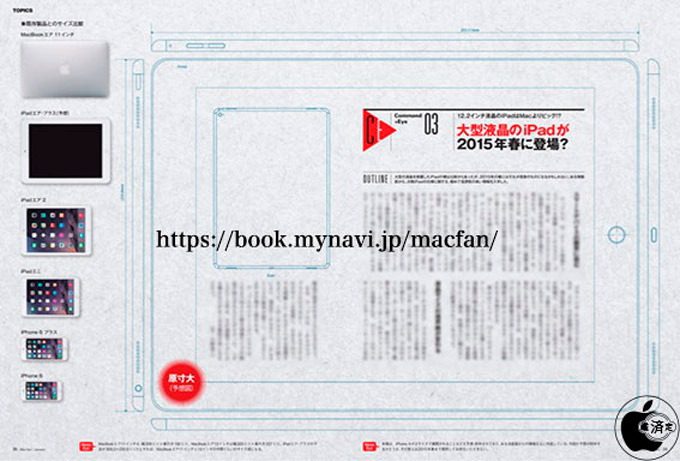 Как сообщает японский ресурс Mac Fan, увеличенная версия планшета iPad получит название «Air Plus», что довольно логично, учитывая недавние iPhone 6 и его вариацию с приставкой «Plus». Стоит отметить, что ресурс Mac Fan ранее уже сливал в сеть схемы нового смартфона iPhone 6, которые в итоге оказались правдоподобными, поэтому источнику вполне можно доверять. Согласно утекшим схемам, iPad AIr Plus получит 12,2-дюймовый дисплей с неизвестным разрешением и следующие габариты: 305,3 х 220,8 х 7 миллиметров. По площади новый планшет будет практически в два раза больше, чем последний iPad Air 2 и почти сопоставим с ноутбуком Macbook Air 13 — 325 x 227 миллиметров.