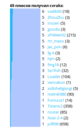 Здравствуйте, недавно я встретил такого пользователя у которого мгновенно появляются плюсы(ссылка на топик внизу). И у него на рейтинге весьма большие цифры, причем у аналогичного пользователя(Loader) количество плюсов заметно отличается. Поэтому я прошу проверить пользователя cvraks на накручивание рейтинга.