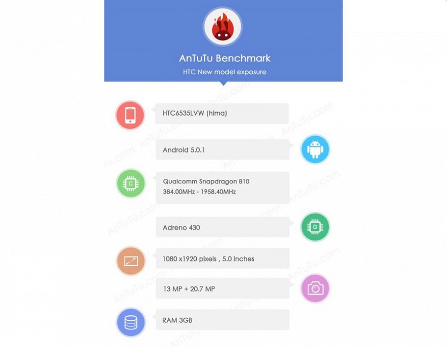 Не так давно мы слышали о утечке технических характеристик смартфона HTC Hima. Что только нам не говорили! То это будет на Windows Phone 10, то обычный бюджетник на Android. Но основные предполагаемые характеристики всё же подтвердились бенчмарком AnTuTu.