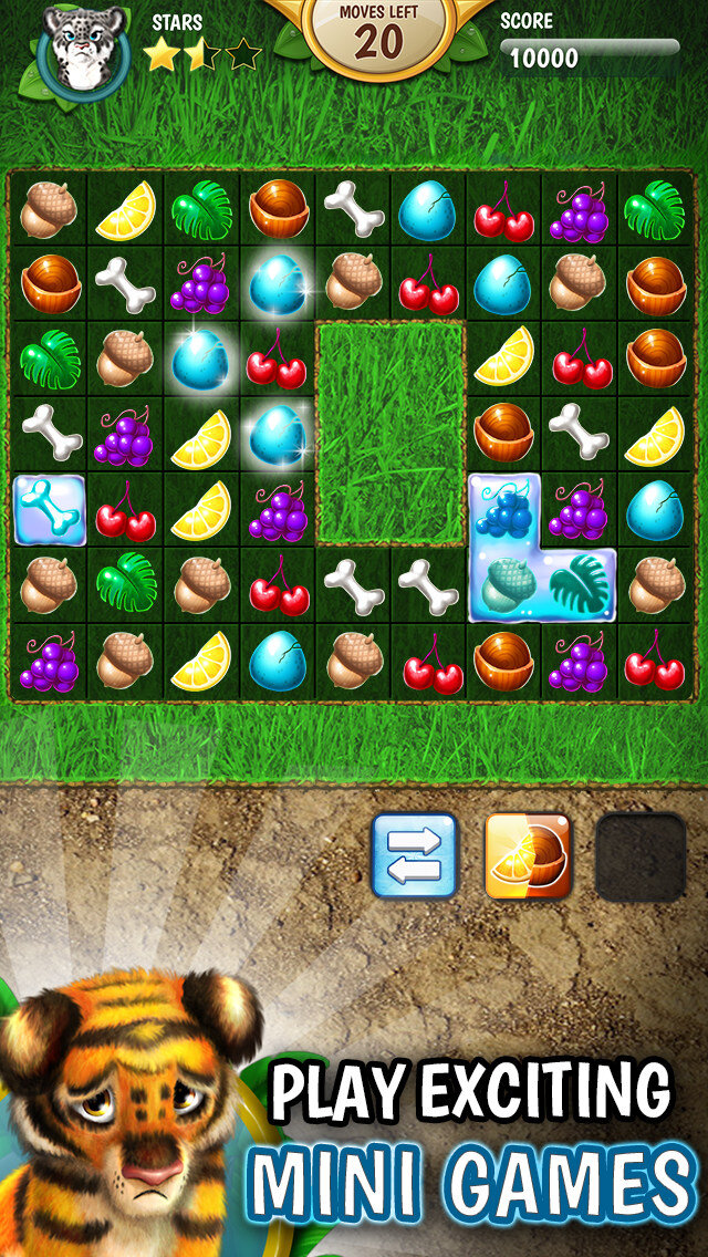 Создание условий для жизни организовано в форме головоломки «три в ряд». Собирайте вместе кости, ягоды и траву и набирайте очки. На выходе получится берлога, убежище или пастбище.