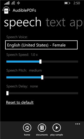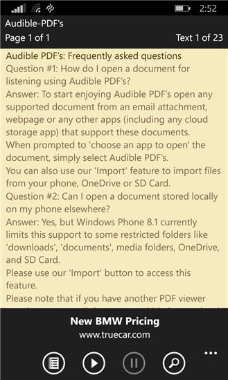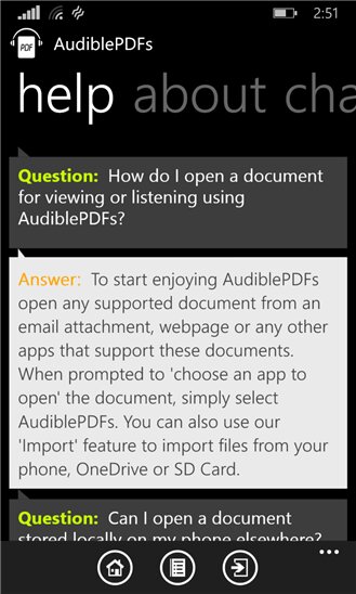 AudiblePDFs является приложением преобразующим текст в речь, которое позволяет просматривать и прослушивать текст, извлеченный из PDF документов, используя любой из предустановленных голосов на вашем Windows Phone 8 устройстве.