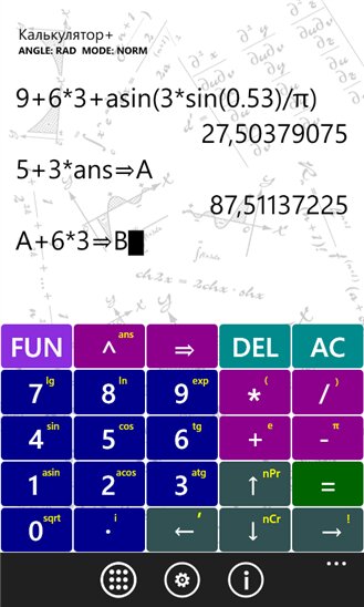 Калькулятор ++ умеет делать все! Это отличная замена стандартному калькулятору Windows Phone®. Он позволяет работать с матрицами, комплексными числами, спец. функциями. Вы не найдете более функционального калькулятора!
