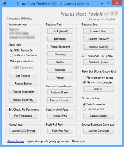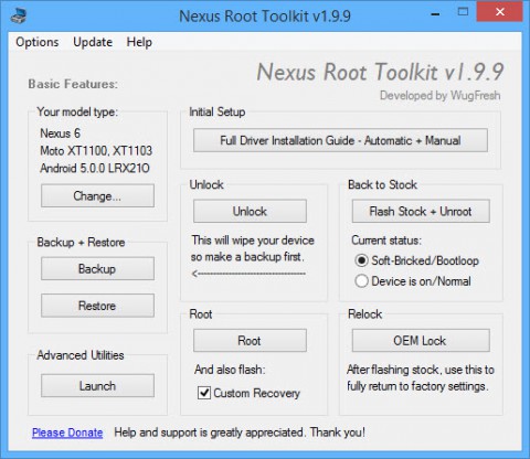 Преступим к получению прав суперпользователя на Nexus 6. «Ломать» Nexus мы будем с помощью Nexus Root Toolkit. На данный момент это самый лёгкий способ. Эта программа может взломать практически все Nexus. В том числе и новый Nexus 9. Возможности довольно не плохие: