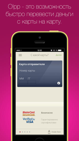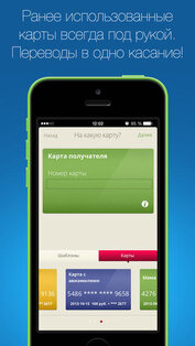 Позволяет безопасно переводить деньги с карты на карту, зная только номер карт получателя. Возможности приложения: — безопасные переводы между картами любых банков РФ и разных платежных систем (с VISA на MasterCard и наоборот) — доступно сразу после установки приложения, круглосуточно, без дополнительной регистрации или посещения банка — создание личного кабинета для сохранения истории операций, создания шаблонов карт персонификации интерфейса (логин — ваш номер телефона, пароль — придумываете сами).