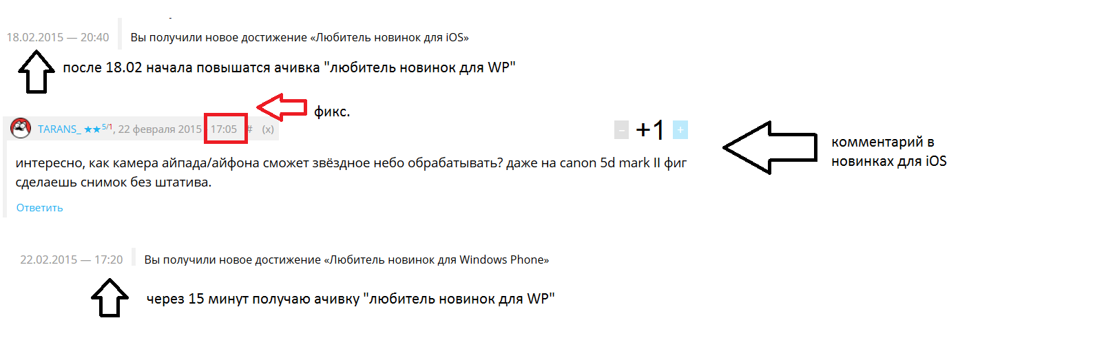 18.02 я получил ачивку «Любитель новинок для iOS», на следующий день (за 19.02) я прокомментировал новый топик, но по какой то причине мне пришло уведомление что я близок к получению ачивки «Любитель новинок для Windows Phone», после чего 22.02 мне даётся ачивка «Любитель новинок для Windows Phone», собственно ошибка? По какой то причине за комментирование топика с новинками iOS даётся ачика WP (а может и то и другое).