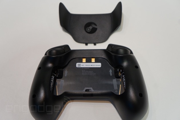 Также на задней стороне геймпада находятся два стандартных стика, как и у всех подобных контроллеров. Геймпад беспроводной и питается от обычных AA-батареек. Напомним, Steam Controller будет работать не только с консолями Steam Machnines, но и с обычными ПК, на которых установлена платформа Steam.