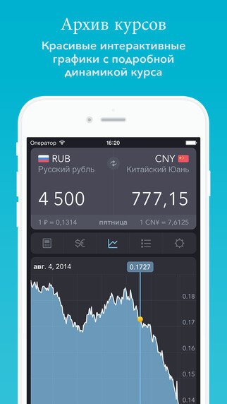 iCurrencyPad также предлагает обновление курса валют мира вплоть до минуты с электронных площадок, и подробных графиков, показывающих текущие и исторические тенденций движения валютных курсов