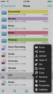 Удаленный доступ может быть обеспечен паролем и локальным кодом доступа. Вы можете посылать документы и файлы из iFiles по электронной почте. Сильно ударьте слева или справа по ячейке файла/папки, чтобы показать popup меню. iFiles имеет возможность записи.