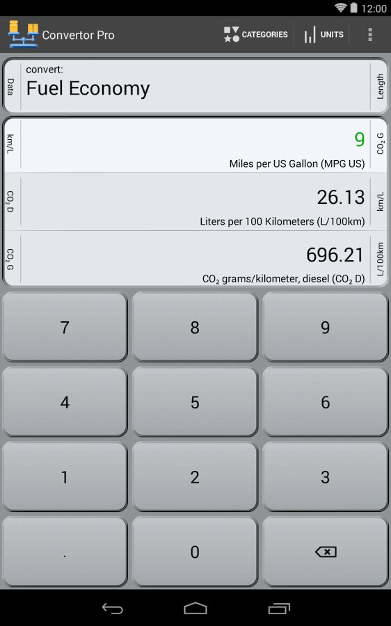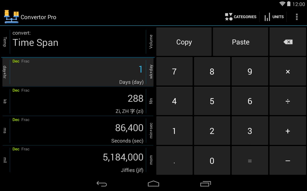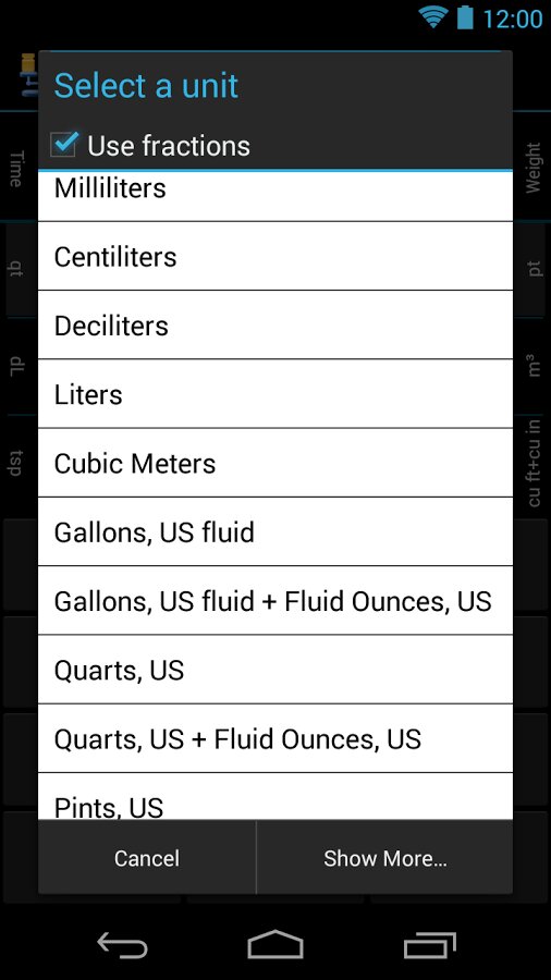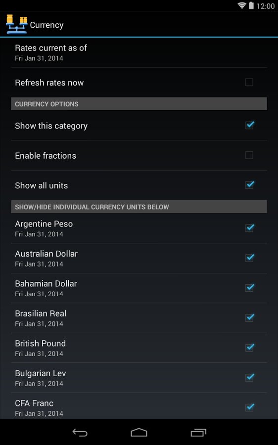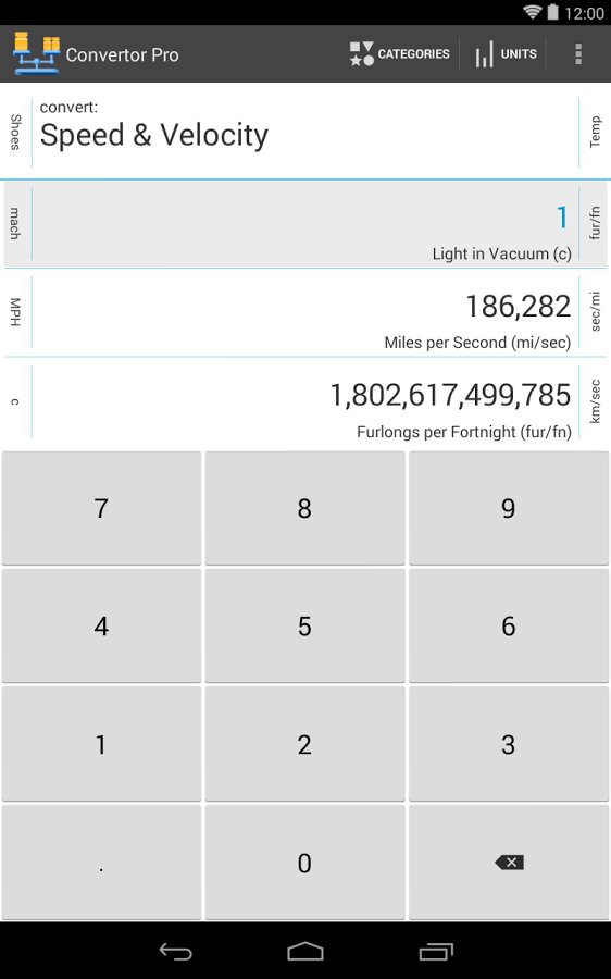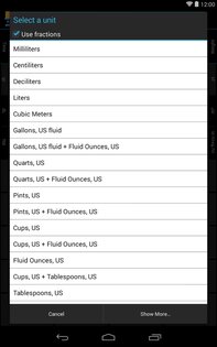 6.0 (Pro) • Add Holo Light skin • Rework button graphics for Holo Dark • Add dynamic row-sizing to display/editing area • Add new fraction increments: 1/10, 1/20, 1/25, 1/50 • User request: add ability «to turn categories on and off at will, preserving the unit selection» • User request: increase the font size of the unit display on the main screen (Android 4.x) • Brighten colors in app icon • Fix bug: Pro showing an upgrade message from the Category list • Currency exchange-rate fixes