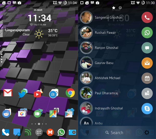 На первом скриншоте вы может видеть колонку точек по левому краю экрана. Простым свайпом из этой зоны вправо у вас откроется окно, как на втором скриншоте. Здесь у нас помимо списка контактов имеется множество функций, таких как телефонный звонок, смс, сообщение по электронной почте, Skype, Google Hangouts и другие.