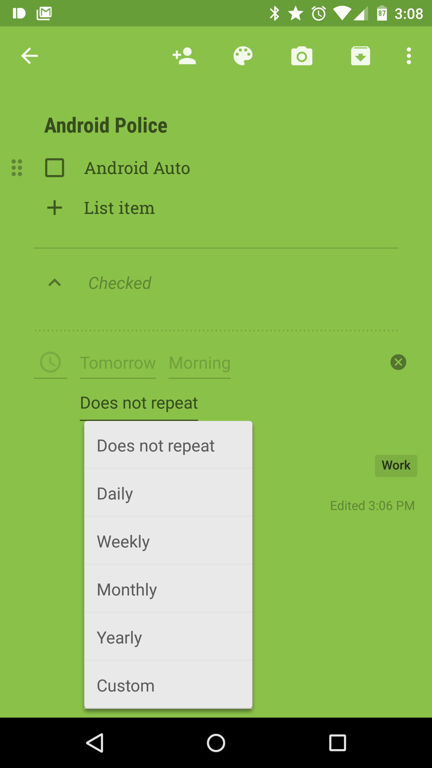 Также в обновлении стала доступна функция включения повторения для напоминаний. Теперь приложение позволяет настроить расписание для определенного напоминания — вы можете сделать напоминание ежедневным, еженедельным, ежемесячным, ежегодным или создать собственный график. Кроме того, не забудьте обратить внимание на новый странный квадратный переключатель в пользовательском интерфейсе для напоминаний — почему Google нарисовала тоггл именно в таком дизайне пока неизвестно, но, очевидно, он абсолютно не вписывается в новую современную концепцию дизайна Material, которая используется компанией Google с недавних пор повсеместно, включая Android, веб-сервисы и все остальные известные платформы.